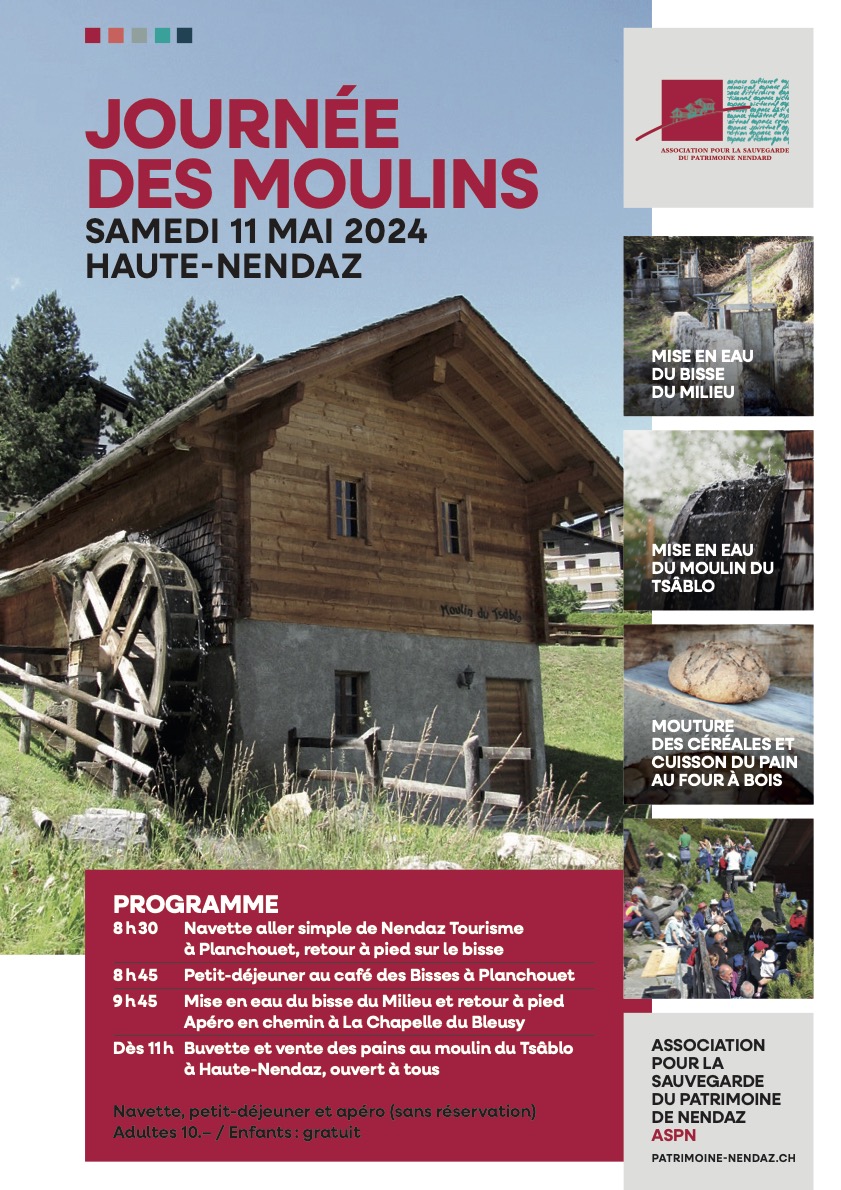 A la fin du 19ème siècle, pas moins de 12 moulins hydrauliques tournaient sur Nendaz. En 1895, l’énorme crue de la Printse et de l’Ogintse en emporta 6 à Beuson. Sur quelques centaines de mètres jusqu’à Sornard, on trouvait quatre moulins, un foulon, une scierie, et une tannerie.
